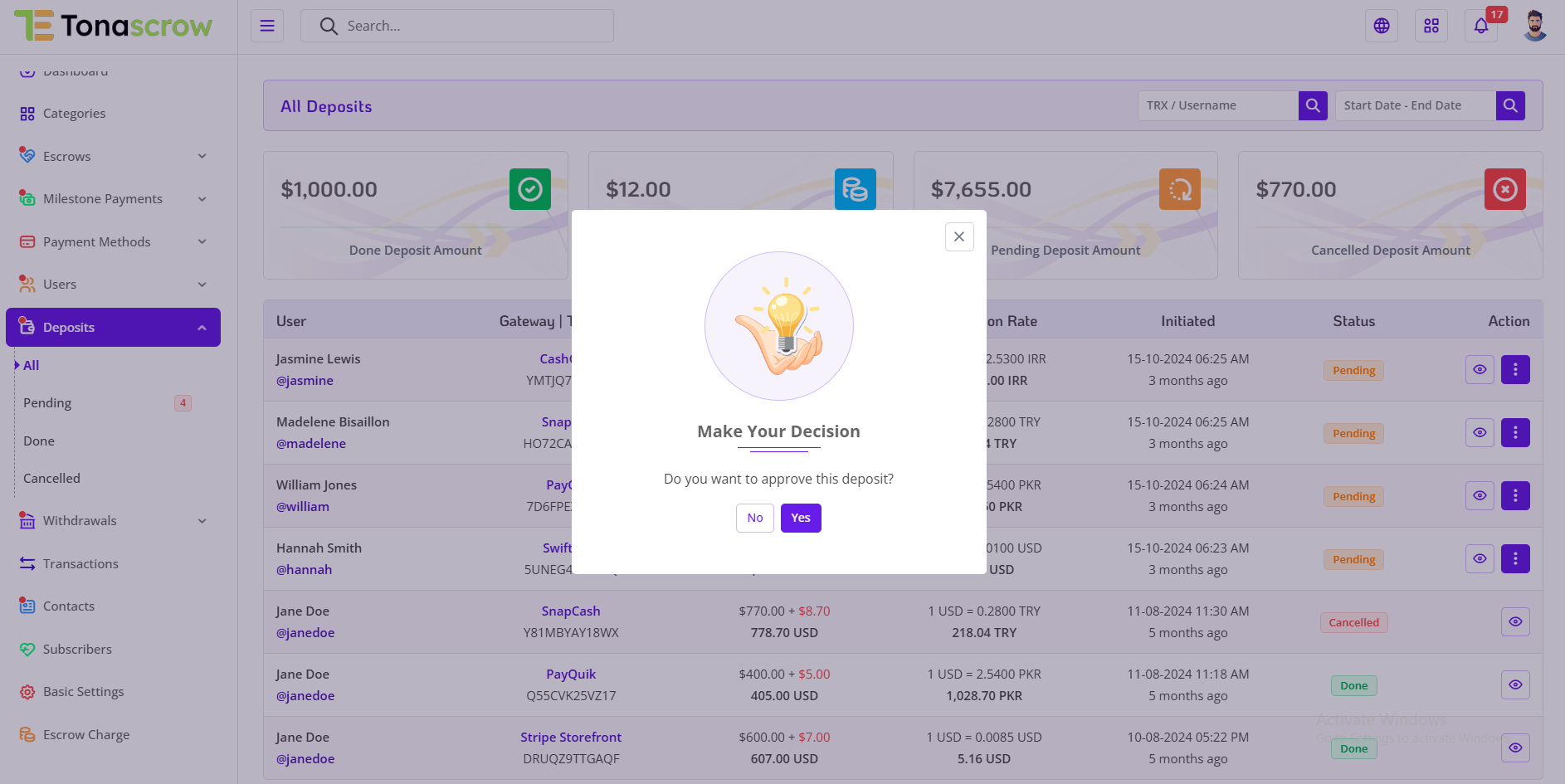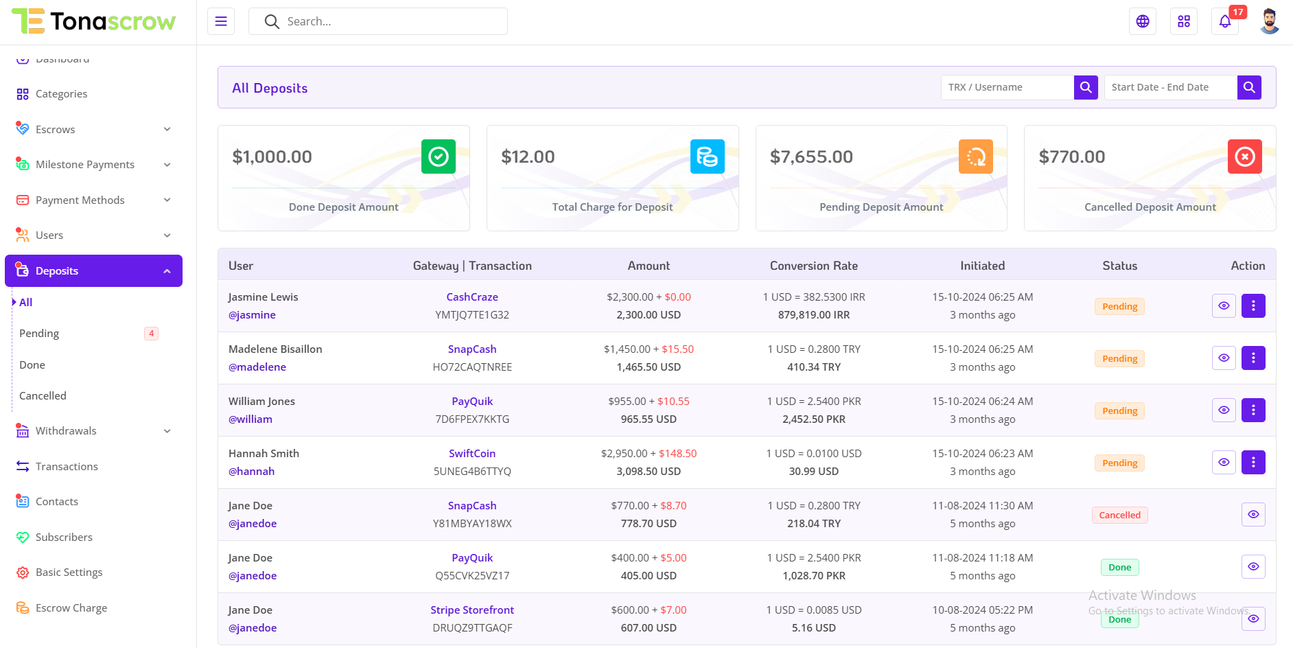 By mastering the features outlined in this guide, you're equipped to effectively manage deposits on the TonaEscrow platform. Whether you're monitoring deposit summaries or analyzing payment gateway performance, your efforts are instrumental in ensuring transparency, accountability, and efficiency in the deposit process.