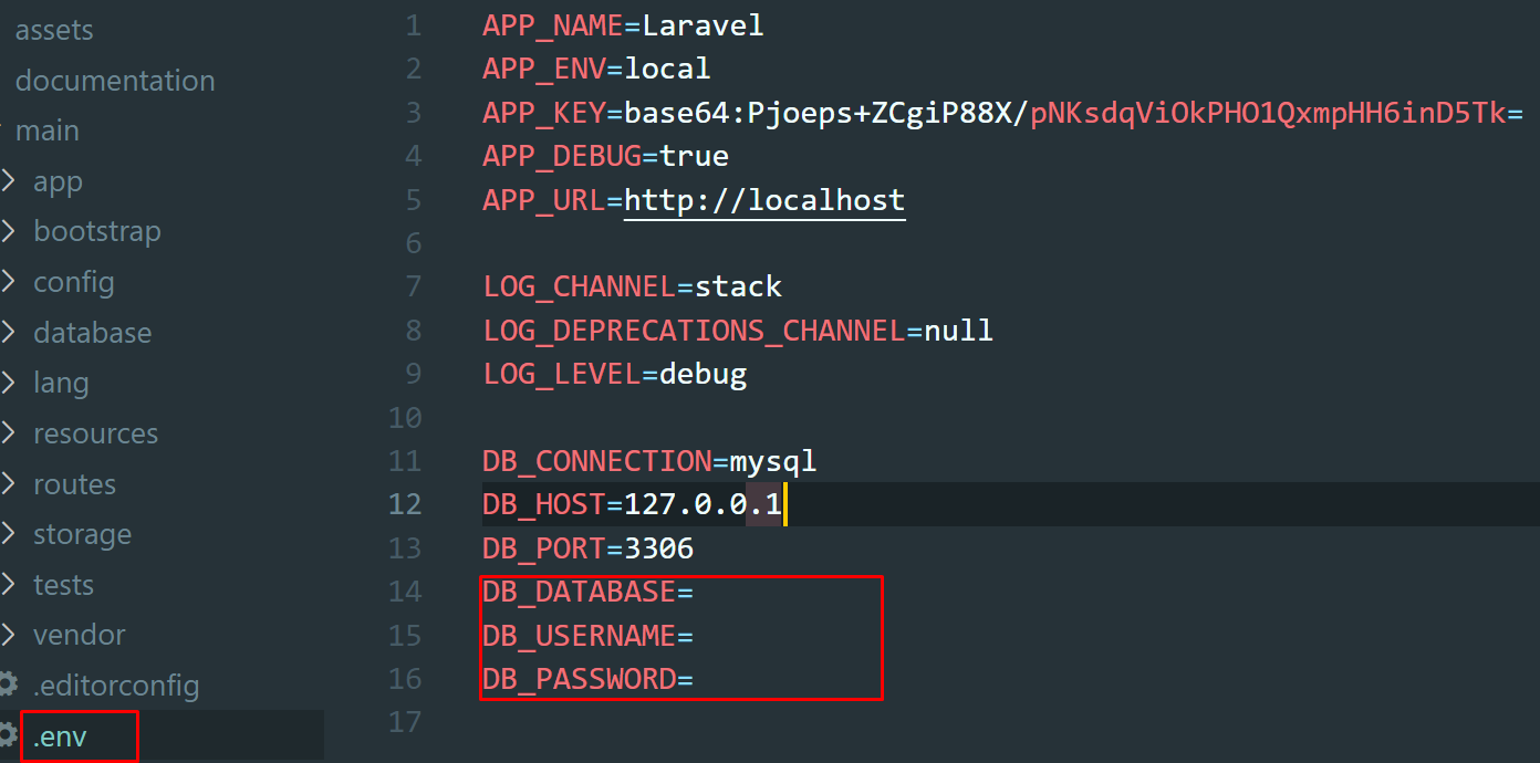 Please look for.envfile. The file location ismain >.env. In your.envfile, update the database connection details as shown below with your newly created database information: