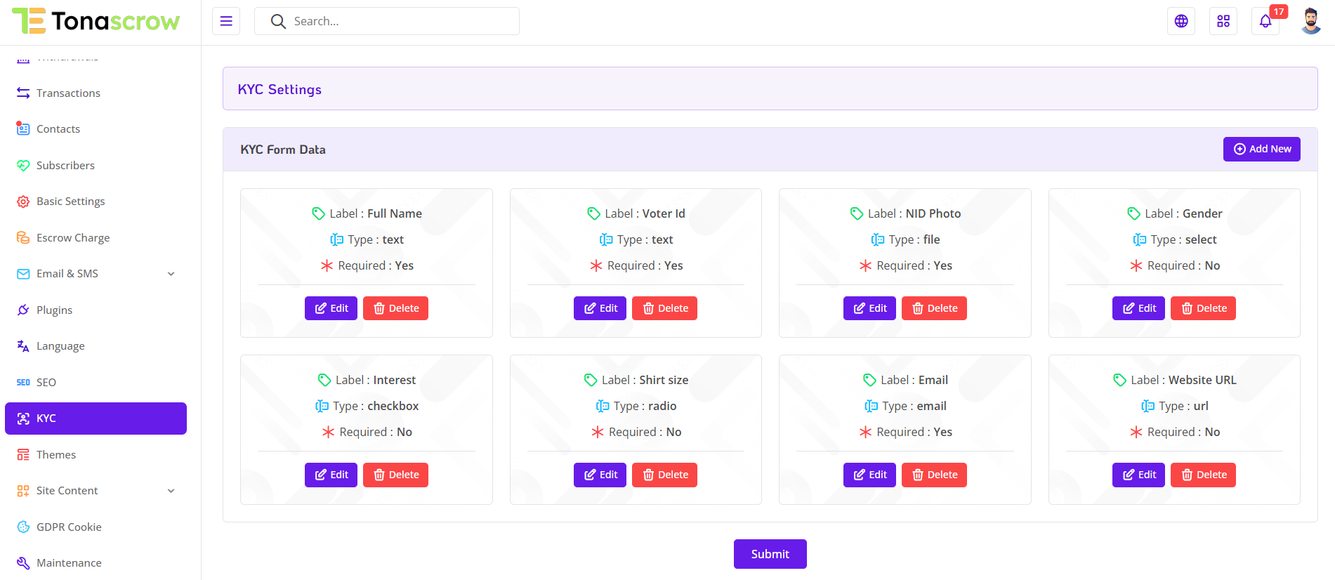 The KYC Manager is a versatile tool that empowers administrators to create a robust and adaptable KYC verification process. By customizing questions, answer types, and requirements, administrators can ensure precise and efficient user verification tailored to the unique needs of the web application.