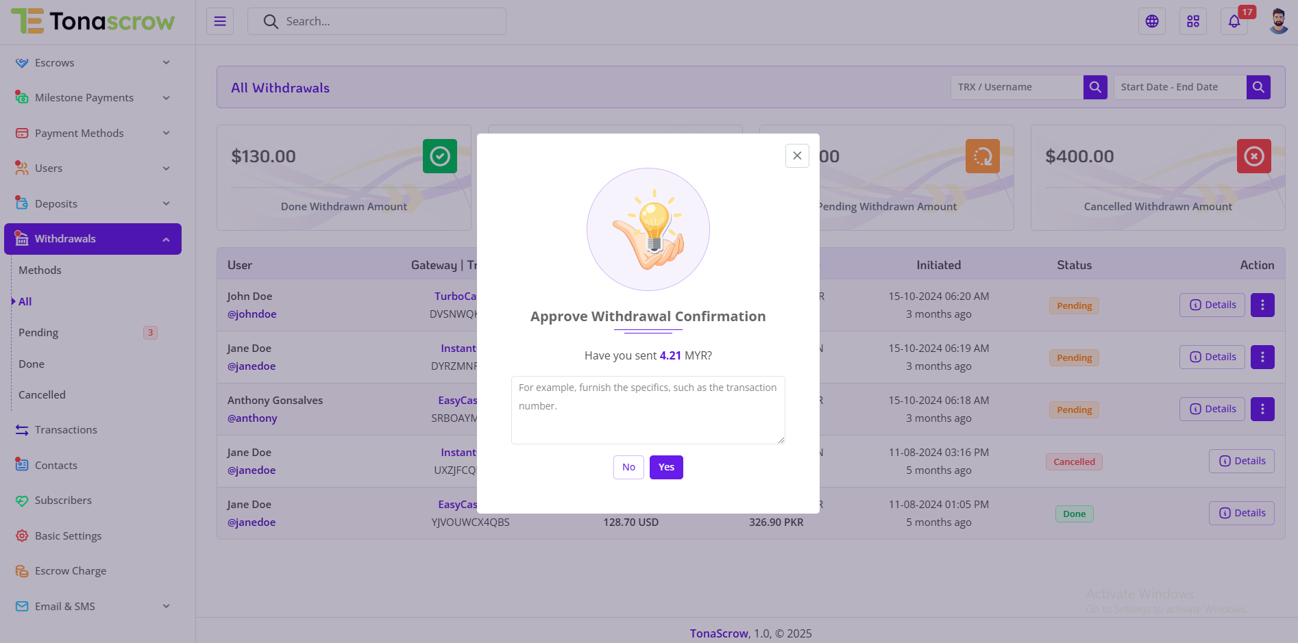 Facilitate a streamlined communication process by allowing administrators to ask transaction proof from users, ensuring a secure and accountable withdrawal process. -