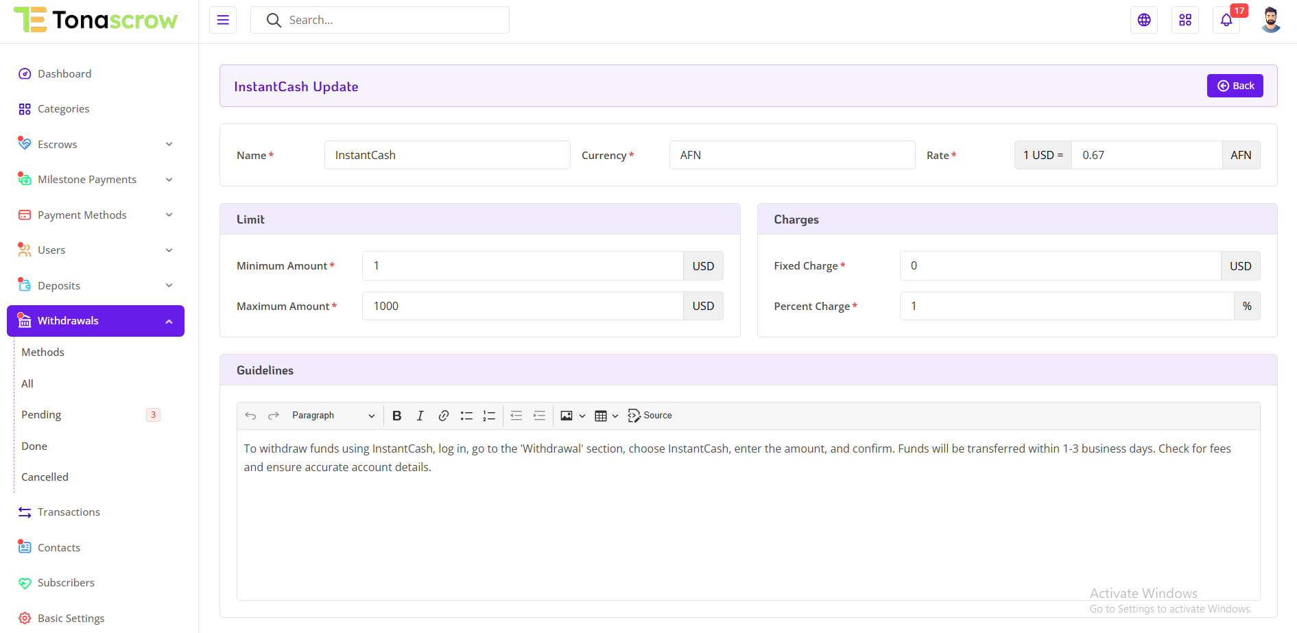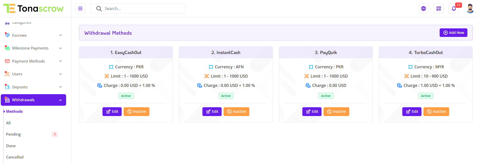 Discover the Withdrawals Method Management Section. Offering administrators detailed control over the manual withdrawal process. This feature-rich page is designed to streamline the management of withdrawal methods, providing clarity and flexibility for administrators.