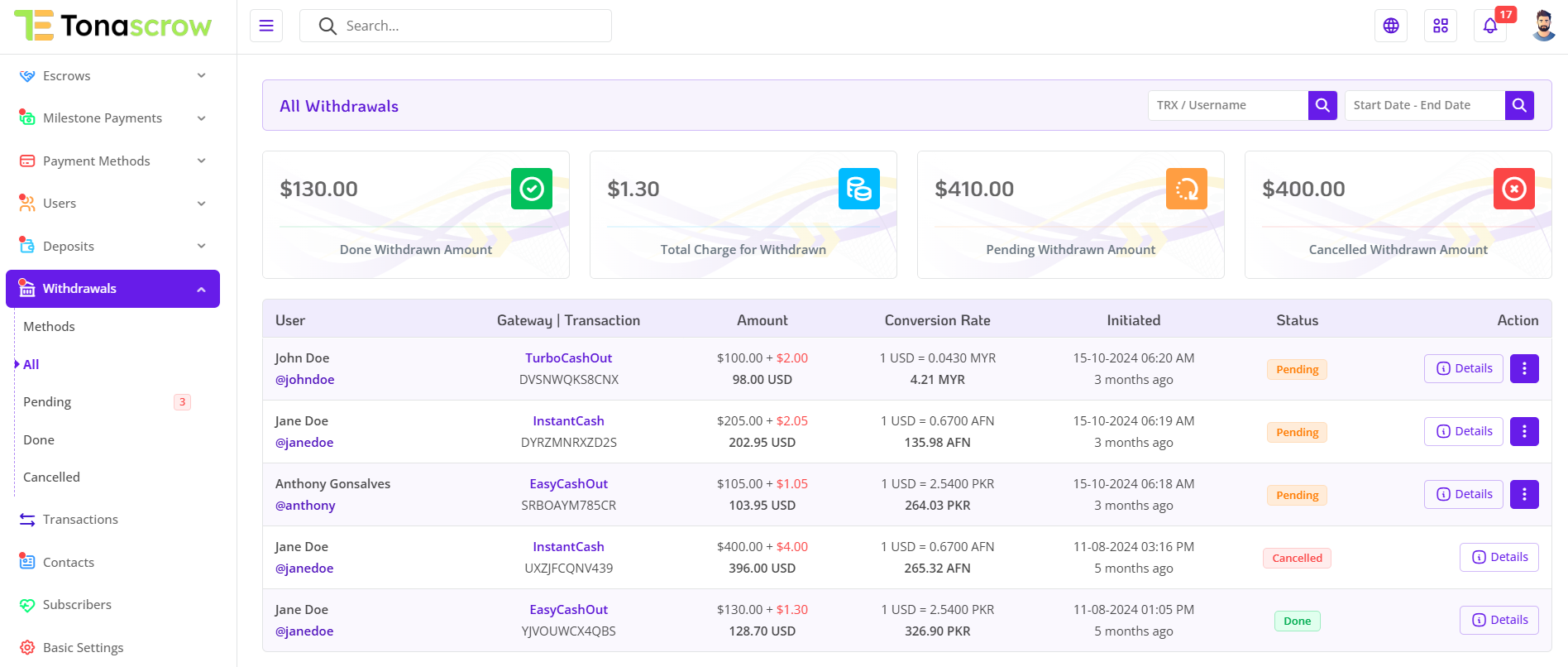 This comprehensive set of features empowers administrators to tailor their control over payout methods and also set of features to efficiently oversee the entire withdrawals process. Withdrawals Management section is designed to enhance transparency, user-friendly, secure manual withdrawal and control in financial transactions on your platform.